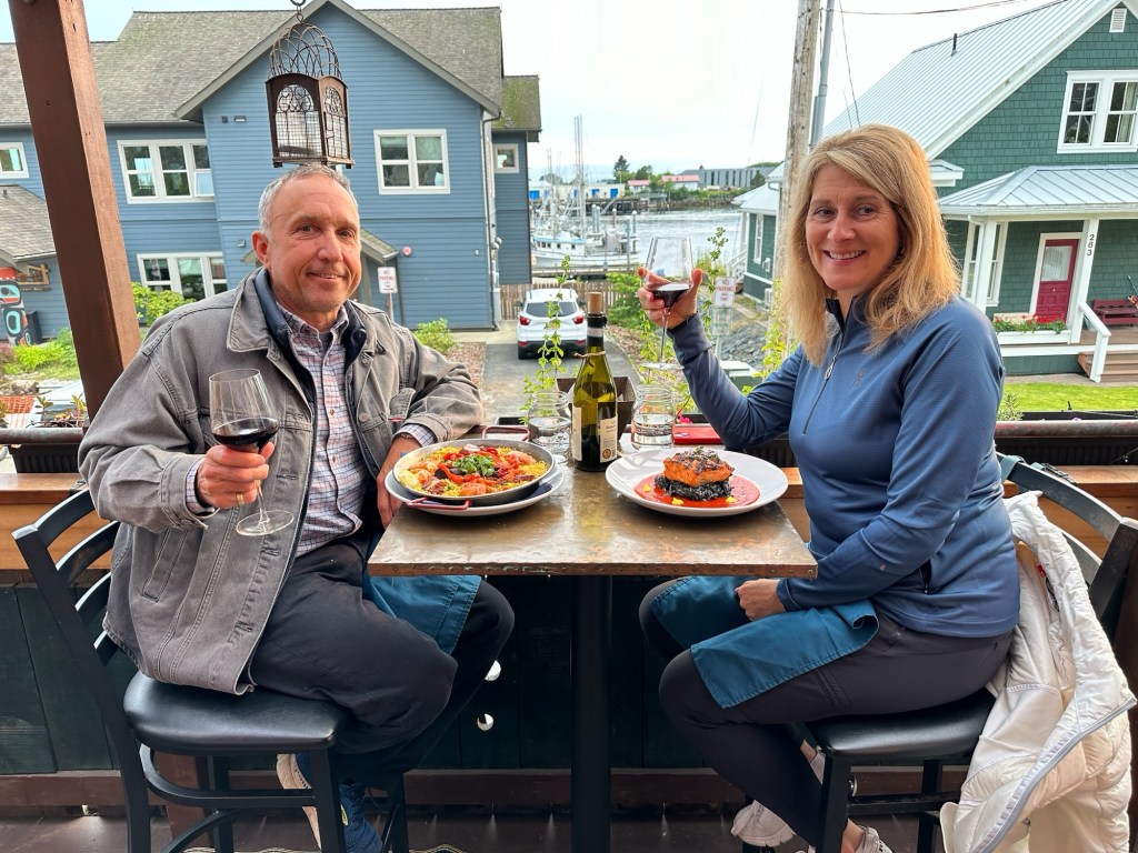 We are back. Took a break yesterday from blogging for a couple of reasons. Firstly we decided to spend the evening out, allowing someone else to sort the groceries and do the cooking. The result was a delicious local fish dinner and a bottle of wine (that is not conducive to trying to then write sensible words). Ludvig’s Bistro turned out to be a good choice, although a week into this trip we are still surprised by the cost of living in Alaska.