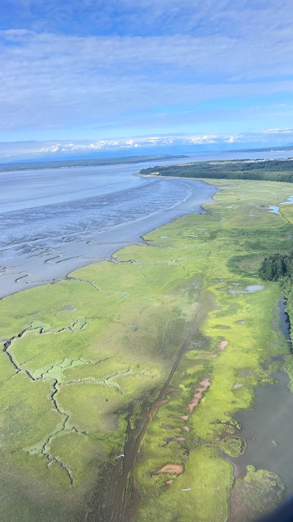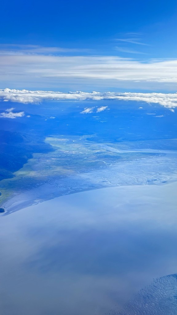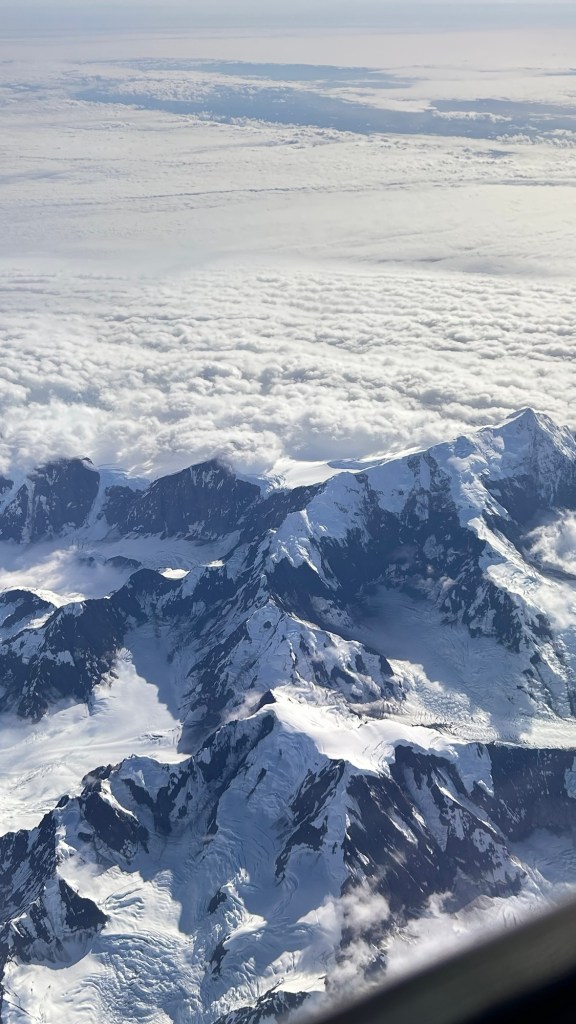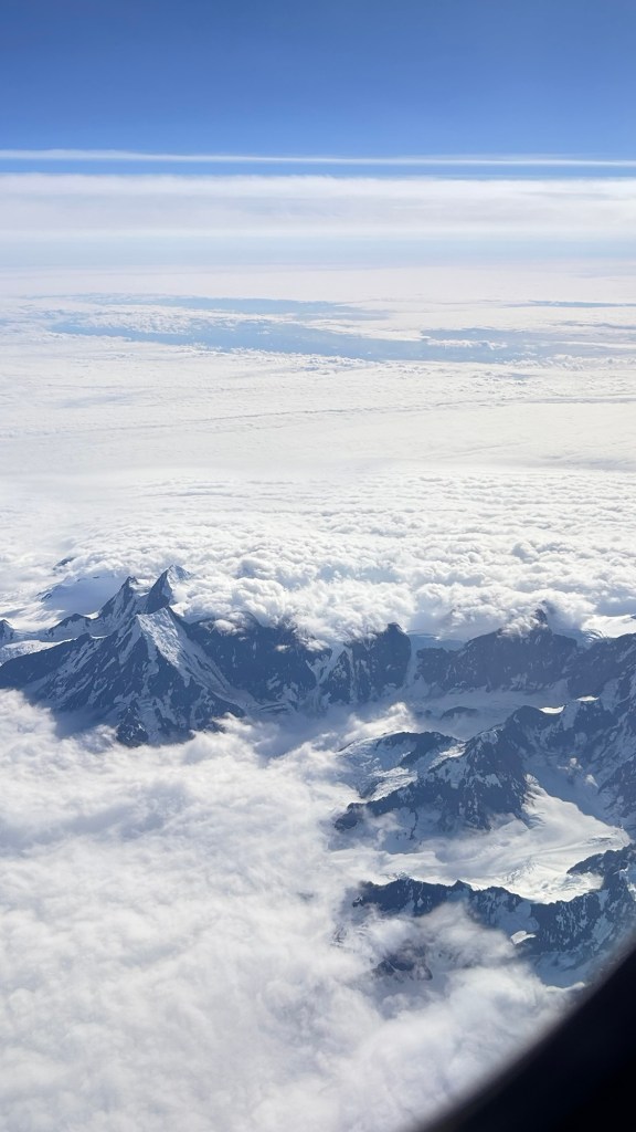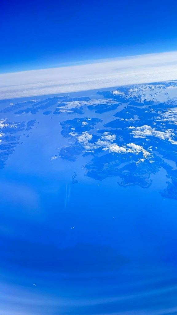 Relieved to say we have taken our last plane ride for another 4 weeks…but it was gorgeous once we emerged from the thick cloud that had socked in over Juneau for our second day. It is weird and slightly unsettling when, cruising at 34,000 feet, you randomly peer out of the plane window to spot tall craggy mountain tops poking above the cloud line.
