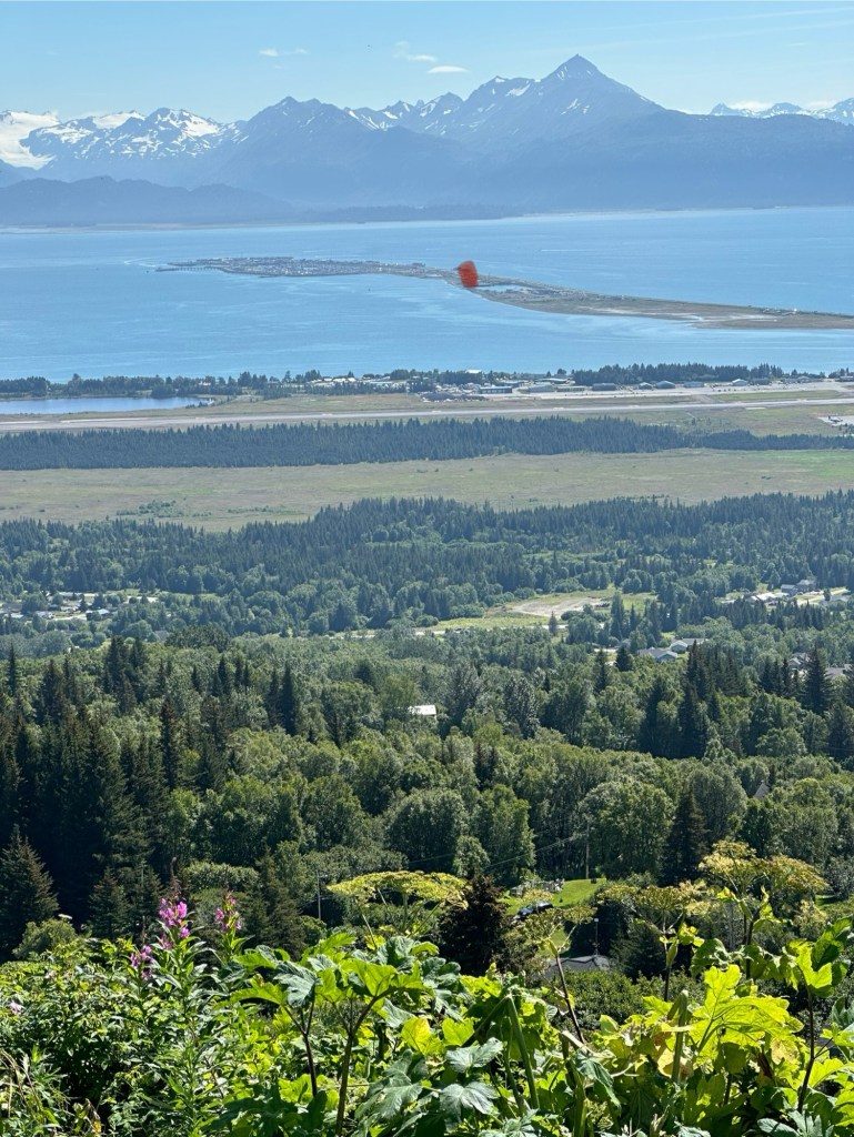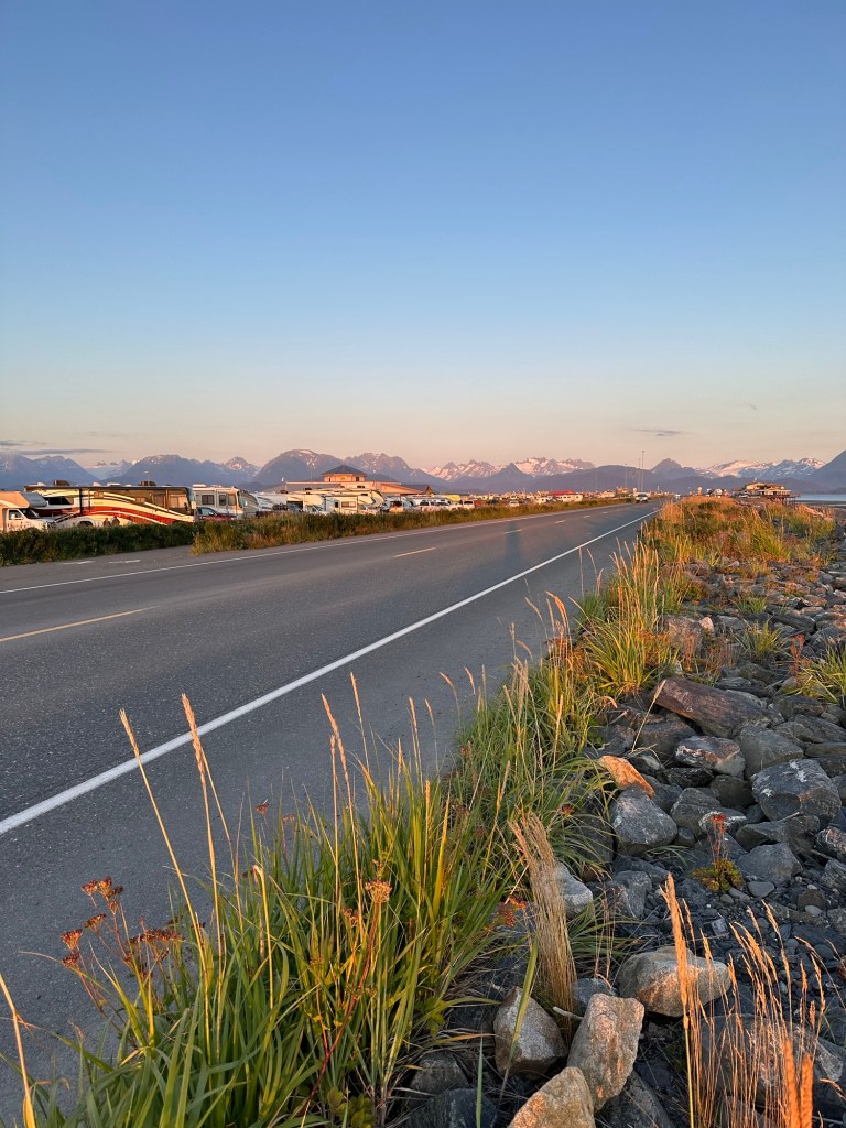 That evening, minus any fish, we reached Homer late on. It is known as the “place at the end of the road“ because you cannot drive any further south by road in Alaska. Homer is a reasonably sized town but its distinguishing feature is the gravel spit that extends some 4.5 miles out into the Katchemak Bay. It is narrow but houses restaurants, fishing charter businesses, gift shops and campgrounds. We checked into the best run campground we have stayed to date but also one with a stunning outlook across Katchemak Bay towards a massive glacial field.