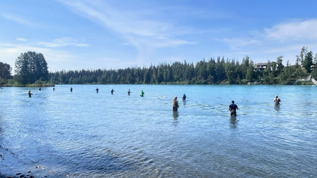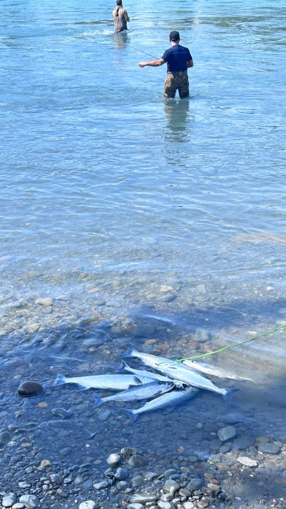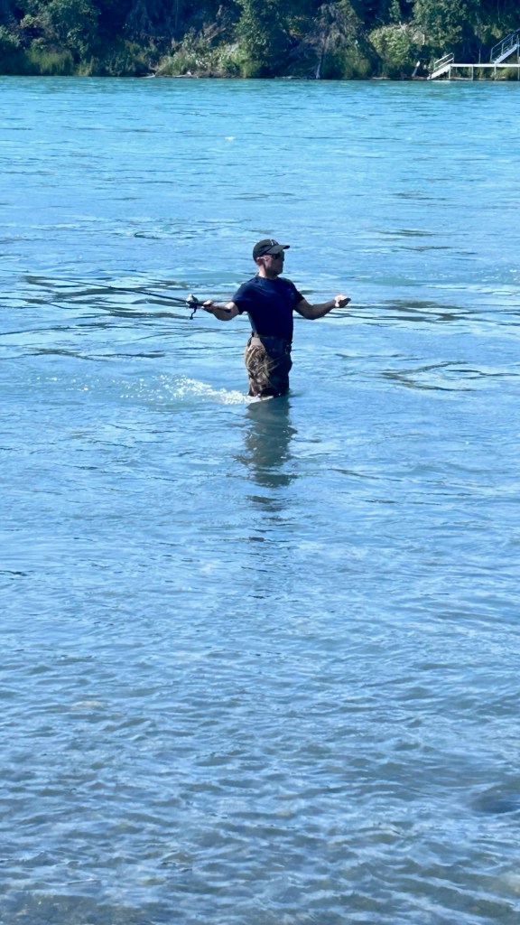 The road follows the Kenai river and its tributaries across the peninsula and is world famous prime salmon fishing terrain. we dont know enough about the intracies of how the various types of salmon running and spawning correlate with one another but have never seen a spectacle quite like the number of people – men ,women and children – all lined up in the river along the easy access points. Regardless of the activity underway, the rivers themselves are spectacularly beautiful. they run fast and clear and many have that glacial blue hue about them.