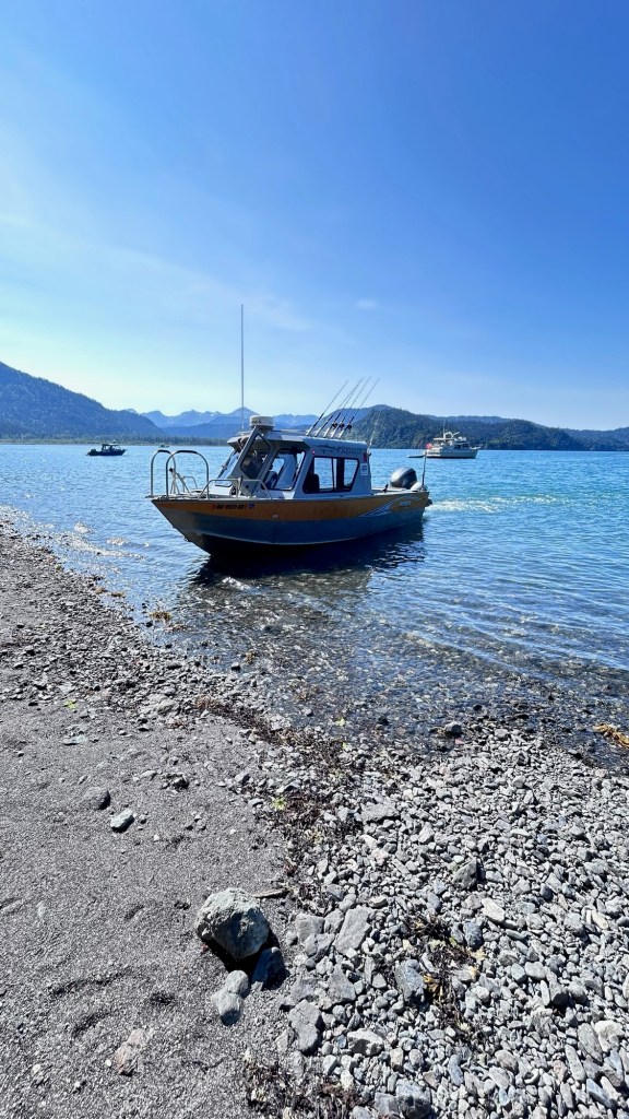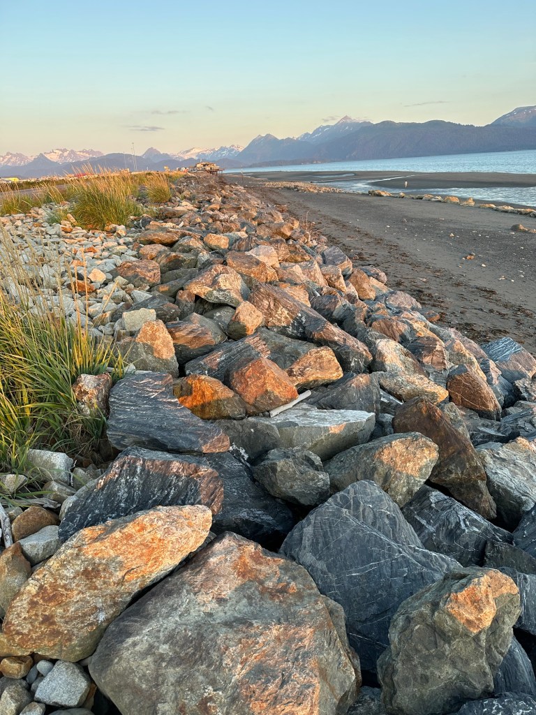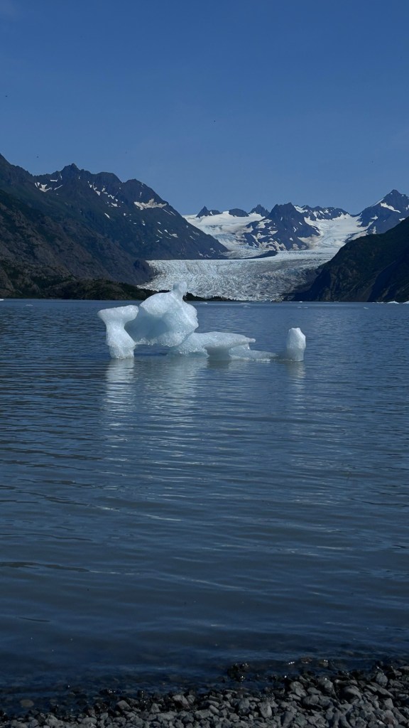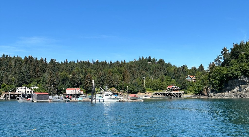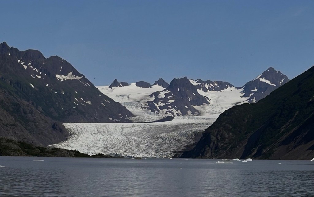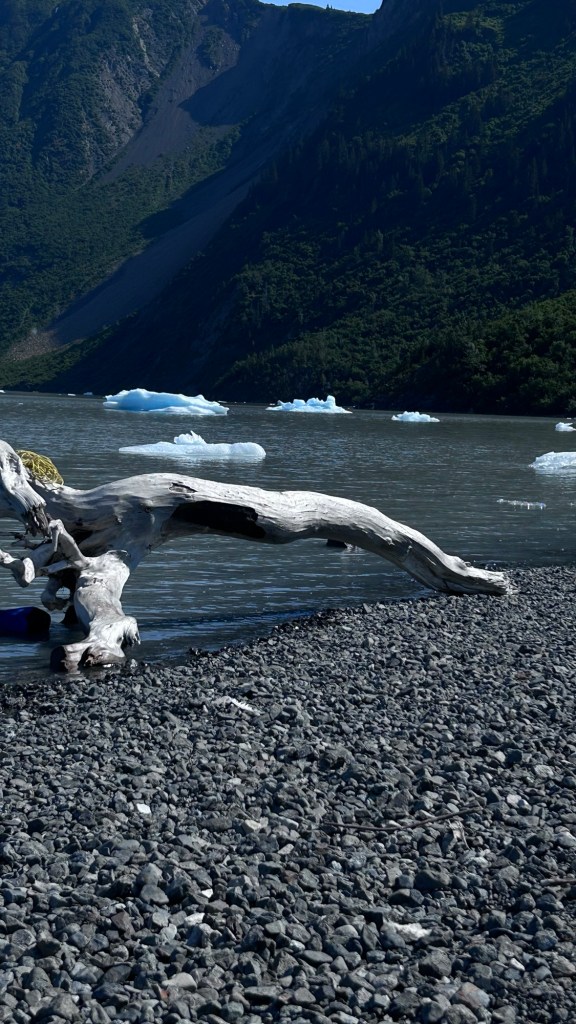 Saturday, after a well needed visit to the excellent supervised laundry room at the campground, we decided we could have as much fun with one of the other cheaper activities available and so headed for a water taxi to take us across the bay to Katchemak Bay State Park. There is a popular hike from the stony beach up over the saddle of the hill to a glacial lake formed at the base of the Grewingk glacier. This is just one of over 30 glaciers that flow off the Harding Icefield on the Kenai Peninsula.