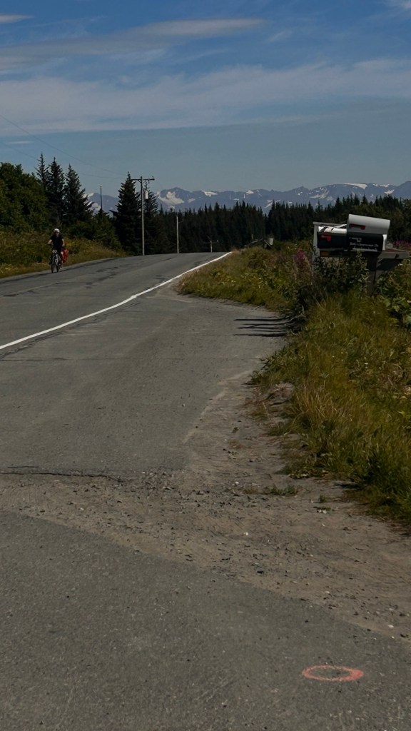We headed up into the hills behind the town and then rode along the ridgeline. Skyline Drive it is called – some thousands of miles from the other Skyline Drive we are familiar with in northern Virginia! Fabulous views out over the bay and down across the Homer Spit. It also provided a clearer perspective of the extent and size of the Grewingk glacier of Saturdays expedition.