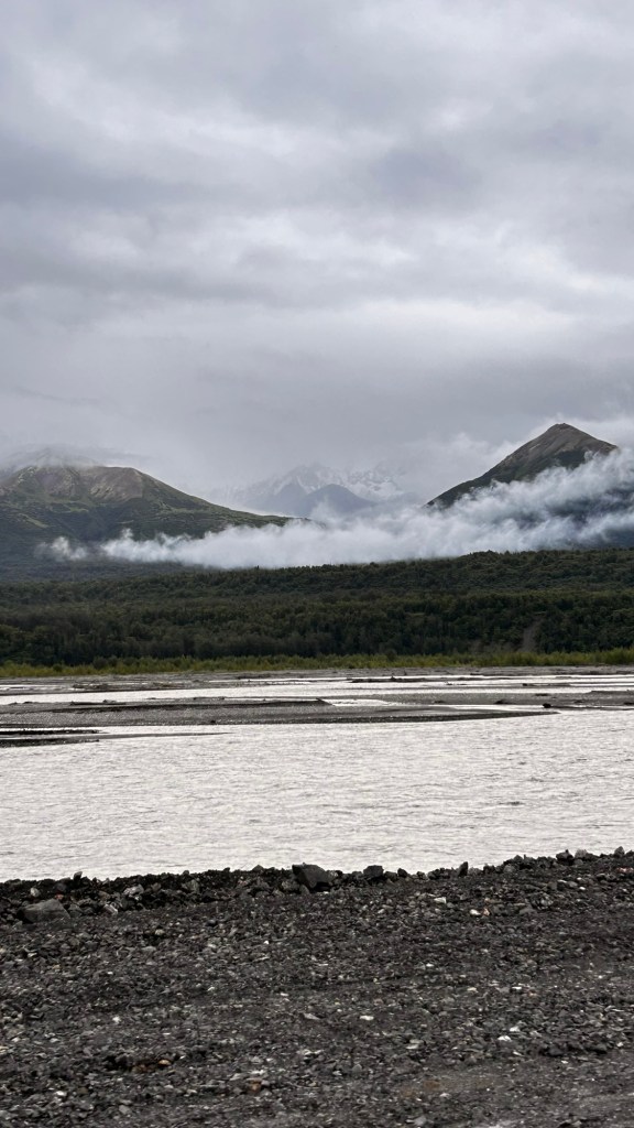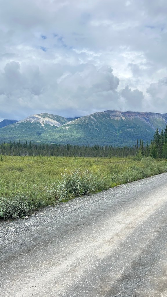 - East along the old Denali Highway which might have given us peeks of the mountain tops through the low lying cloud but we would have missed the long valley vistas.