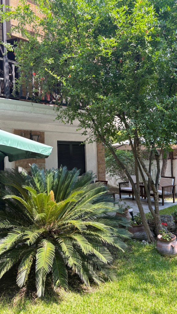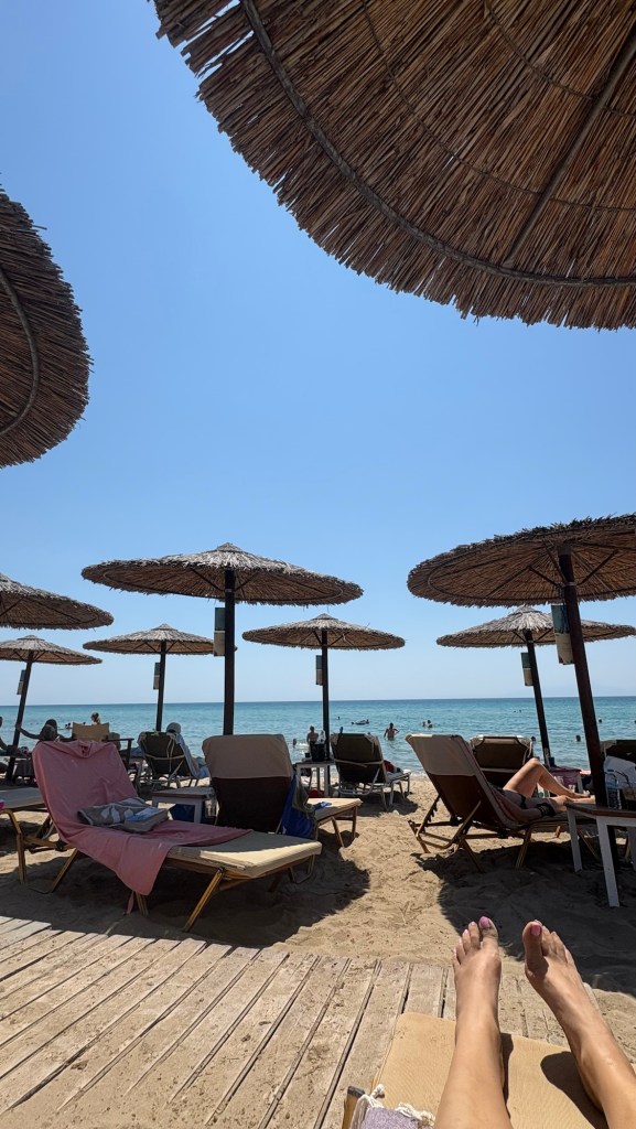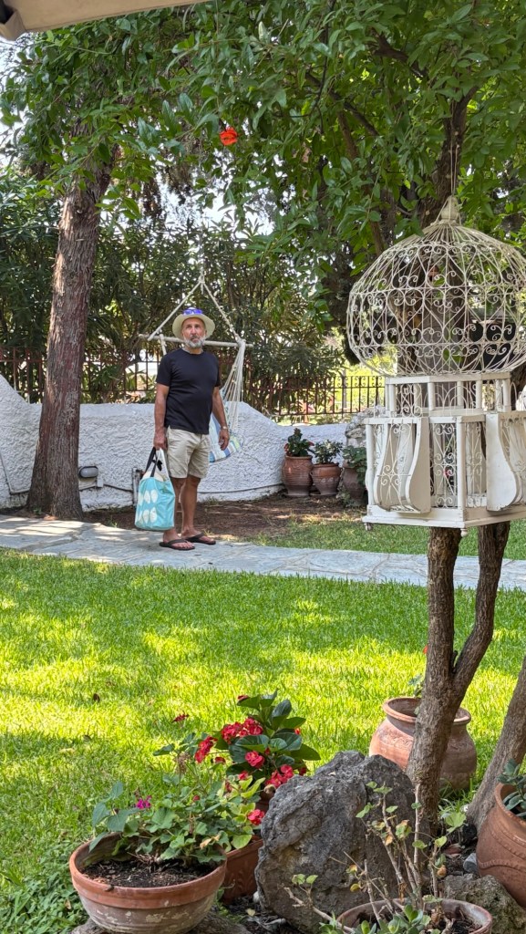 Our home is the ground floor and garden of a traditional Greek home. Many houses have 2 or 3 floors but with each floor being a completely self contained unit with its own separate entrance. It is beautifully maintained by the owners. We have everying we need to be comfortable, relaxed and as self contained as we want to be. Better still the beach is a 4 minute walk away with calm warm water and plenty of space to set up. Alternatively , there are a number of beach bars with loungers. Much to our delight, they do not charge…… only requirement is you buy one of their drinks, the cost of which also pleasantly surprised us. “ Where is the catch we wondered?”