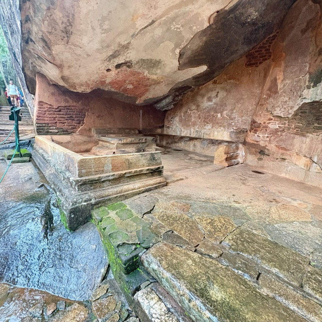 A depression in the rock contains the remains of some fifth century wall paintings. They are known as the Sigiriya frescoes and depict women of various ages and ethnicity. The detail is impressive but for those who do not wish to attempt the metal circular staircase that provides access to the caves, there is a good reproduction in the museum on the grounds.