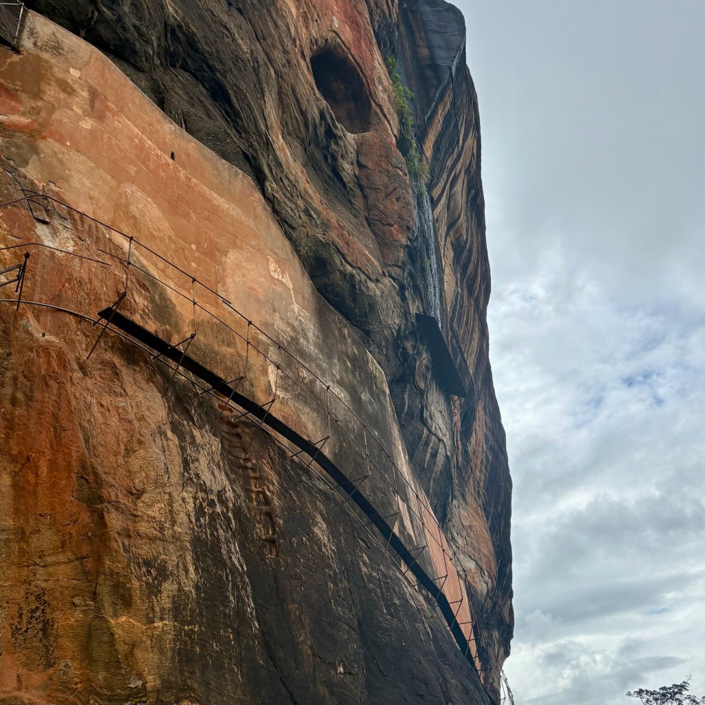 The Lions Gate is the entrance to the final climb to the top. It is the most difficult and steep section. The name of the rock is derived from the Sinhalese word for Lion rock – Sinhagiri. Anyone with a fear of heights, even a mild fear, will need to dig deep to undertake the somewhat crowded ascent to the very top. After passing between what remains of the great lion – 2 massive paws with claws – access is by way of a steel set of steps that winds up the side of the rock. Those ascending and descending occupy the same structure for approximately half of the undertaking and there are rails to hold onto for the nervous. It would be misleading to suggest it was anything other than a free for all and perhaps a little overcrowded. We encountered children, families, stray dogs and mature adventurers on the expedition to the top.