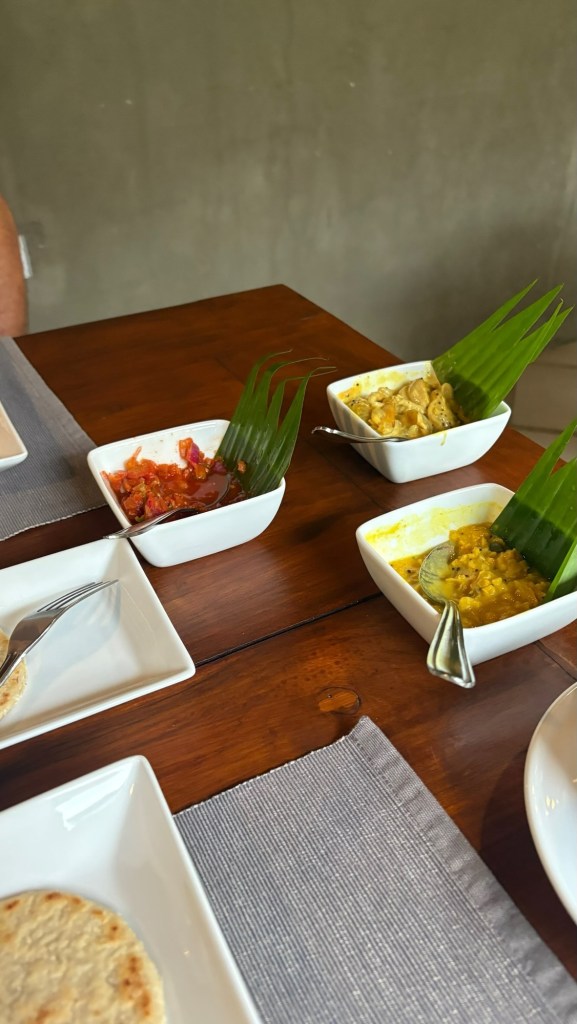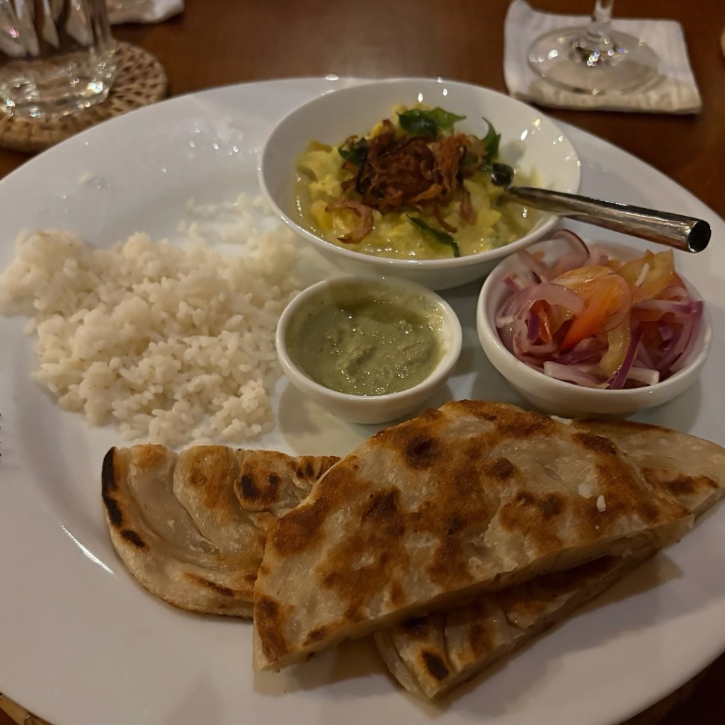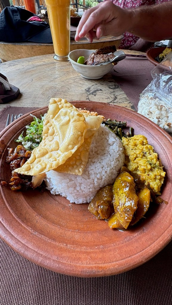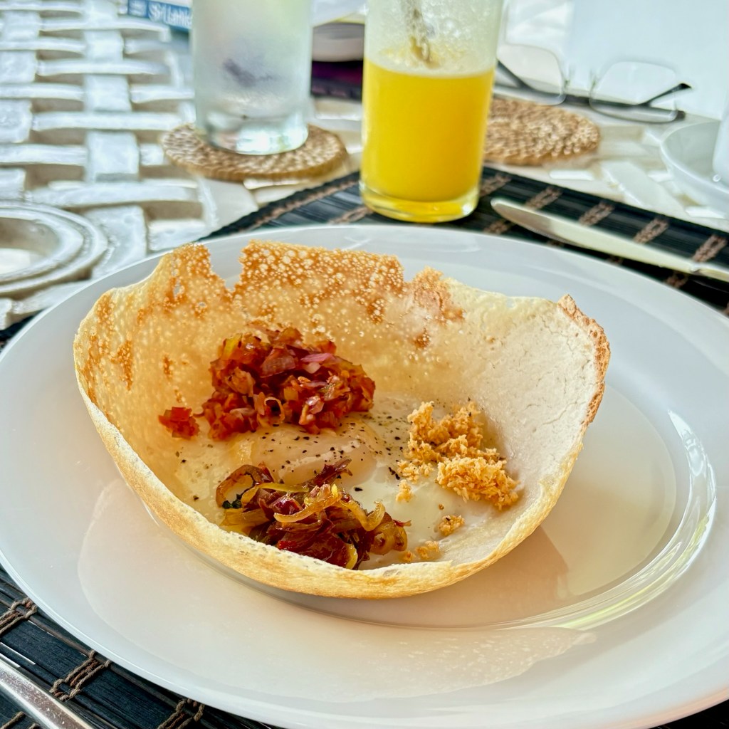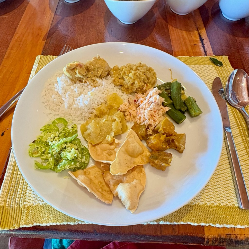 The “light” breakfast always consisted of fresh squeezed juice of whatever local fruit was available that day. we werespoiled for papaya, pineapple, watermelon,mango or mixed fruit. Granola was served with ‘buffalo curd” a yoghurt alternative. Tasted good.the heavier Sri lankan breakfast. “hoppers” a cross between an american pancake and a crepe made with rice flour and coconut milk – both locally available ingredients . Served with egg, coconut sambal, aubergine and caramelised onion. afternoon tea was far more interesting than sandwiches and cakes. curry and rice always seemed to require multiple dishes and multiple types of curry for each meal. Self discipline was required but did it taste fantastic!Is your mouth watering yet?