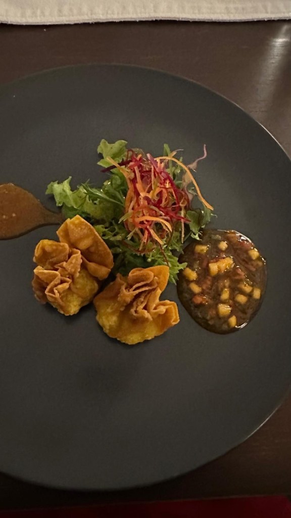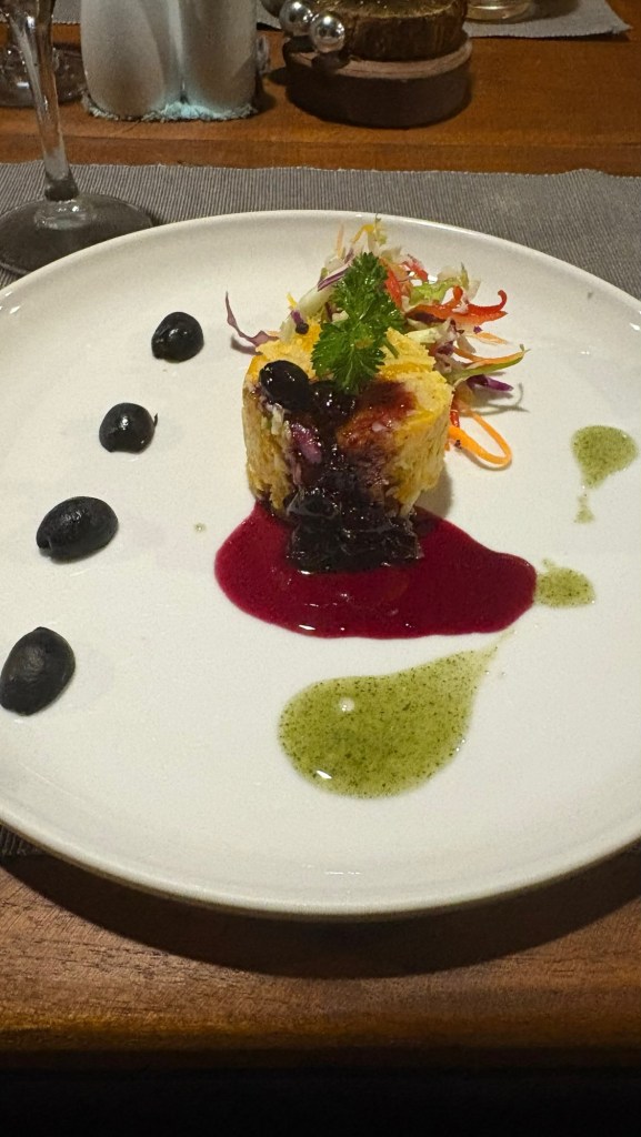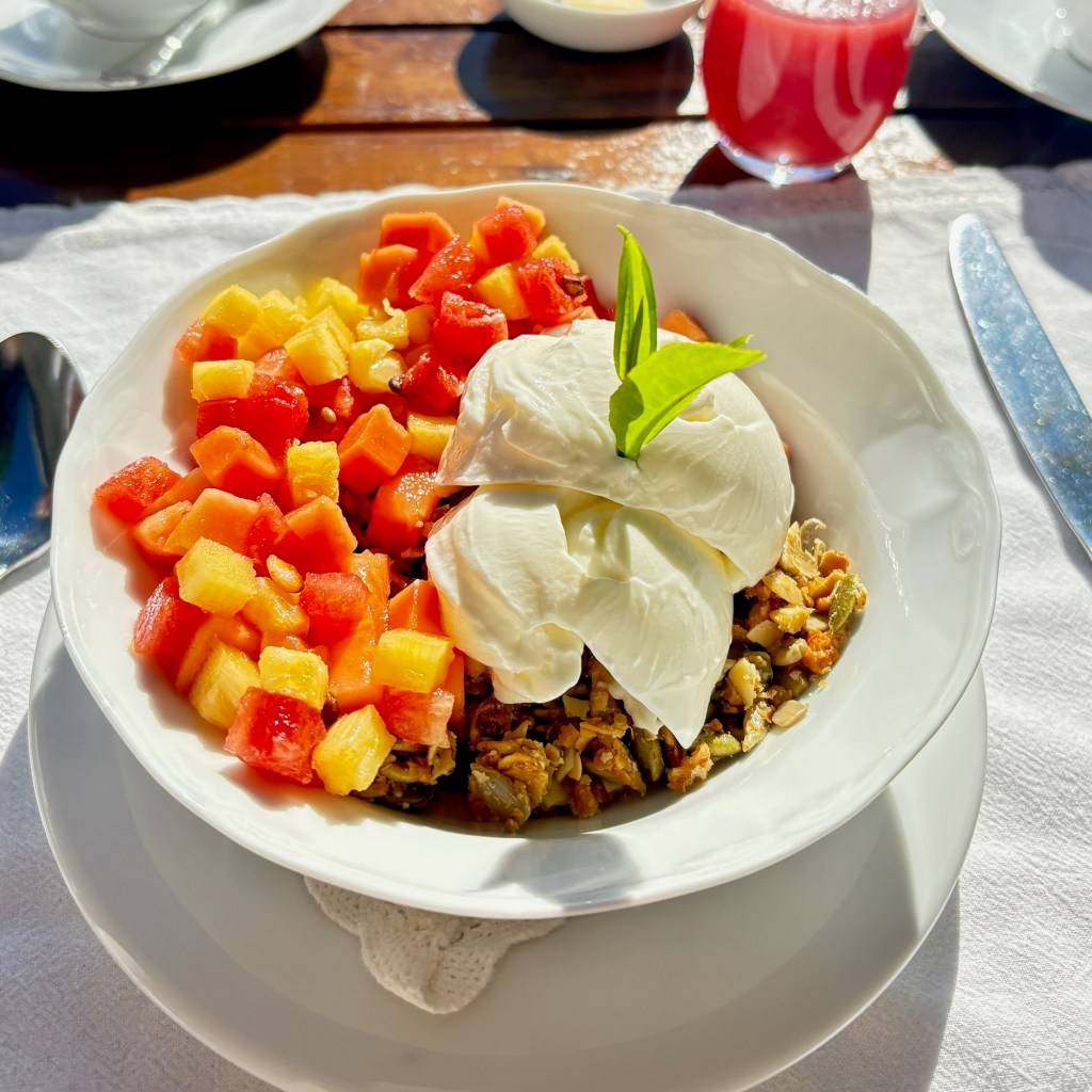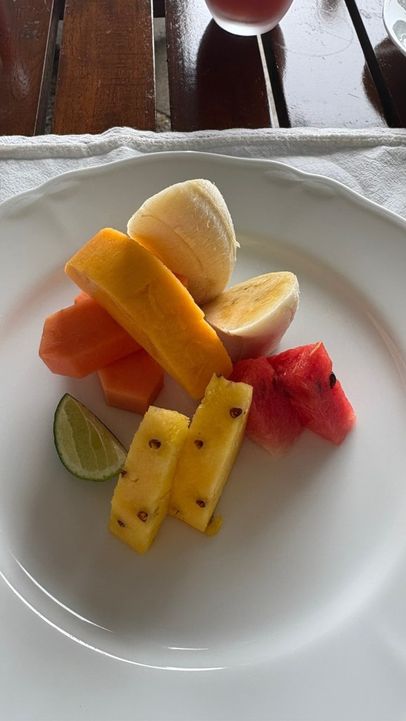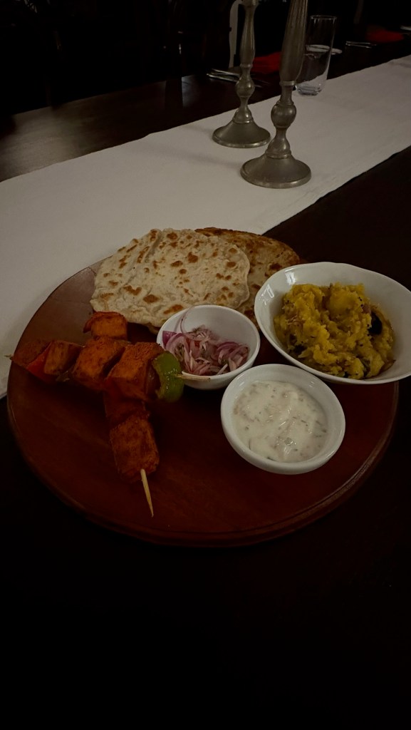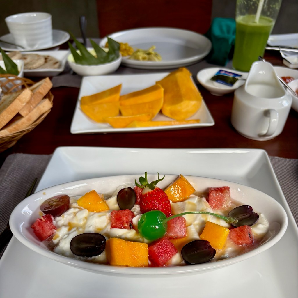 The “light” breakfast always consisted of fresh squeezed juice of whatever local fruit was available that day. we werespoiled for papaya, pineapple, watermelon,mango or mixed fruit. Granola was served with ‘buffalo curd” a yoghurt alternative. Tasted good.the heavier Sri lankan breakfast. “hoppers” a cross between an american pancake and a crepe made with rice flour and coconut milk – both locally available ingredients . Served with egg, coconut sambal, aubergine and caramelised onion. afternoon tea was far more interesting than sandwiches and cakes. curry and rice always seemed to require multiple dishes and multiple types of curry for each meal. Self discipline was required but did it taste fantastic!Is your mouth watering yet?