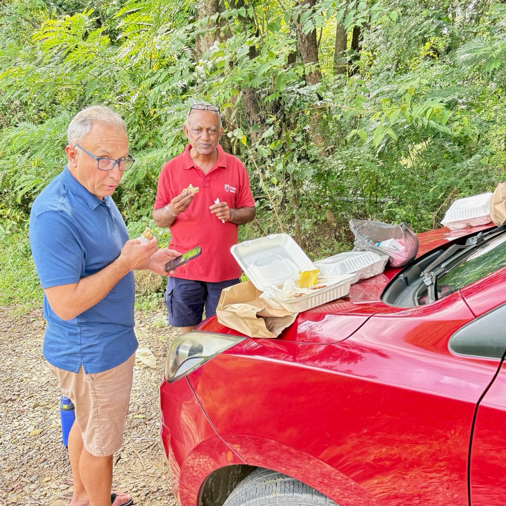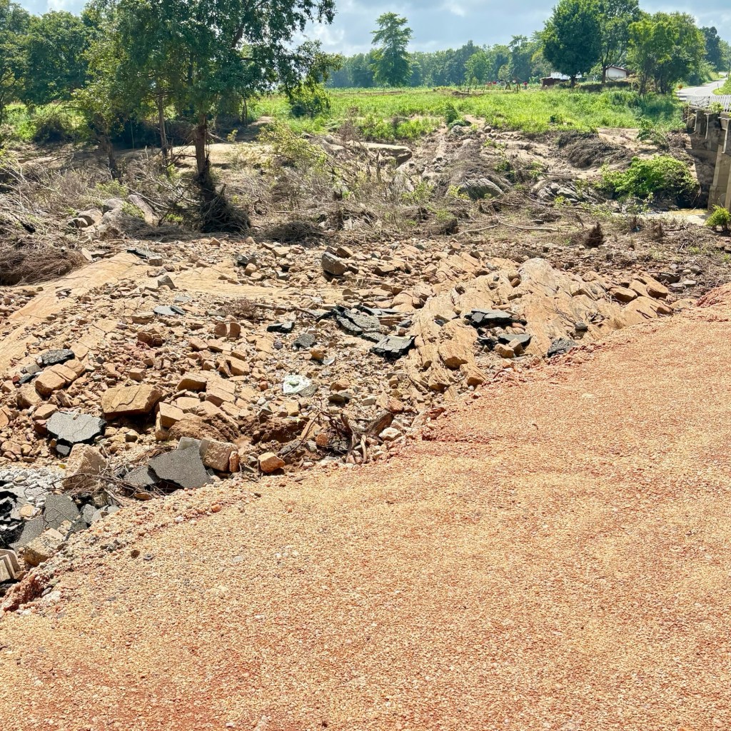 note the broken branches showing how high the river level got.the river burst its banks and created new paths of flowreconstructed road and bridge over the rivera short stop for lunch by the side of the road involved sharing with the local wildlifethanks for the banana – yum